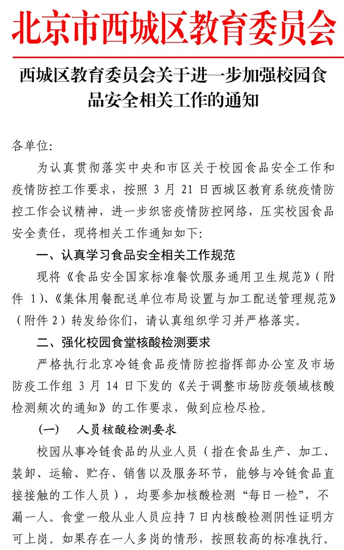 西城区教育委员会关于进一步加强校园食品安全相关工作的通知