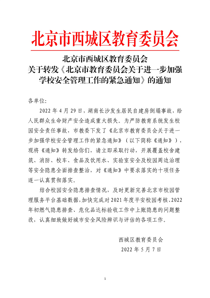 关于转发《北京市教育委员会关于进一步加强学校安全管理工作的紧急通知》的通知