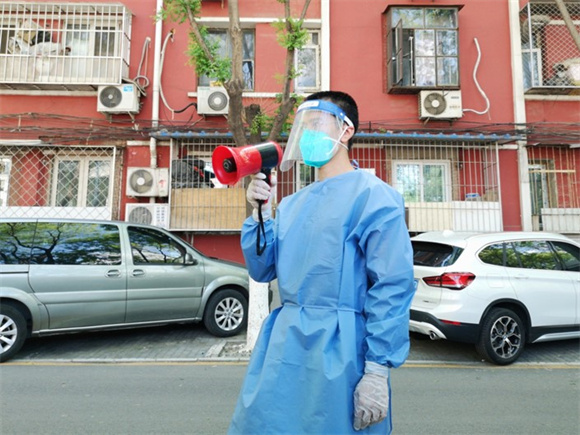 贾坤老师是我校一名地理教师,兼任高二1班班主任工作,作为一名共产党员,在“五一”假期期间主动向所在社区党委报到,在丰台区洋桥北里社区核酸检测采样点,他穿上蓝色的一次性防护服,戴上医用面罩,连续三天协助社区工作者组织居民开展核酸检测工作。从秩序维护、宣传指导到清洁消杀等服务,保证了核酸检测工作高效有序进行。从“三尺讲台”到“抗疫一线”,贾坤老师用自己的实际行动诠释着教育工作者的初心和使命,用实际行动给学生们上了一堂生动的社会责任课。