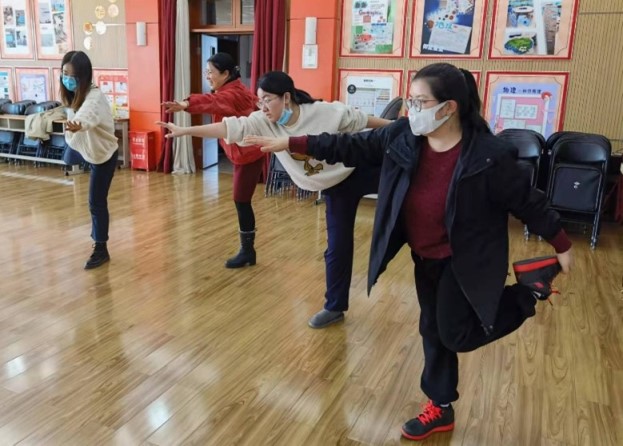 王老师首先带领老师们进行了一系列热身活动,舒展肩、颈、髋、腰、臂、腿,伸展拉筋,活动后大家感觉身体轻松了许多。老师们工作繁忙,伏案工作时间长,身体灵活度欠佳,通过热身活动,大家放松身心,暂时放下工作,以轻松愉悦的状态投入即将开展的活动。