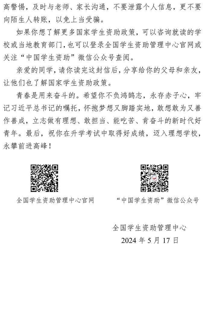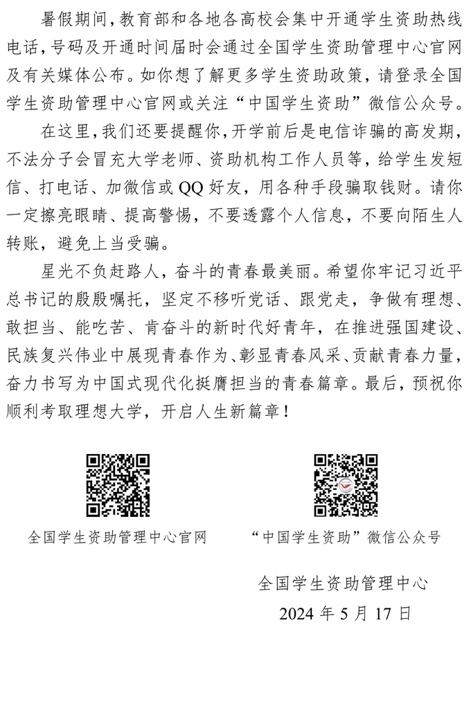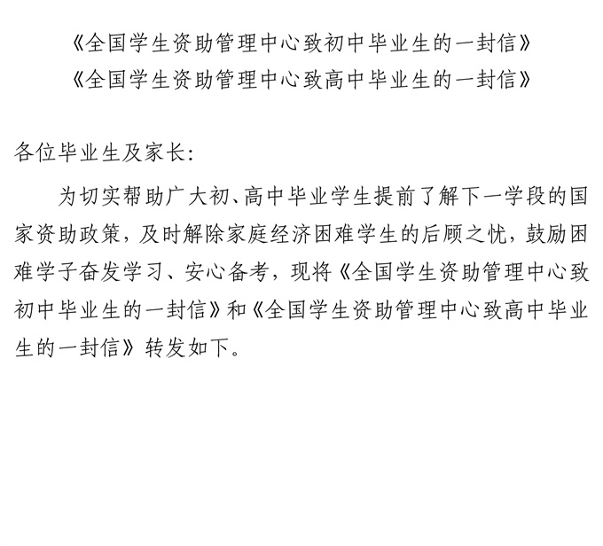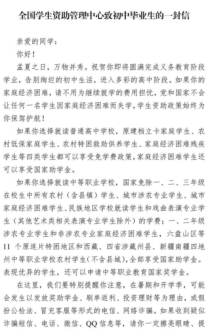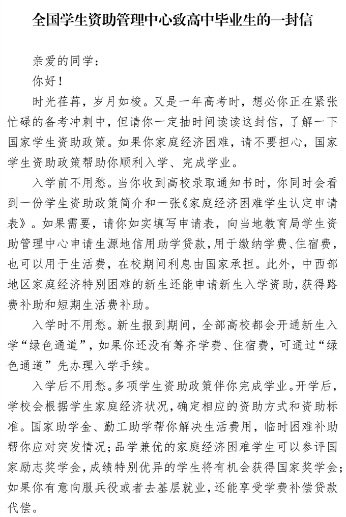 全国学生资助管理中心致初、高中毕业生“两封信”